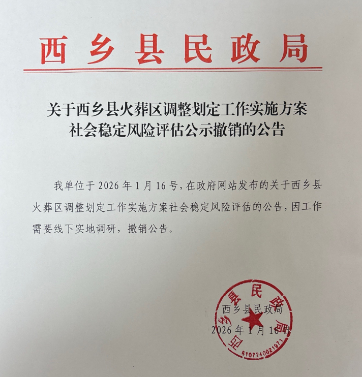 西乡县民政局关于西乡县火葬区调整划定工作实施方案社会稳定风险评估公示撤销的公告