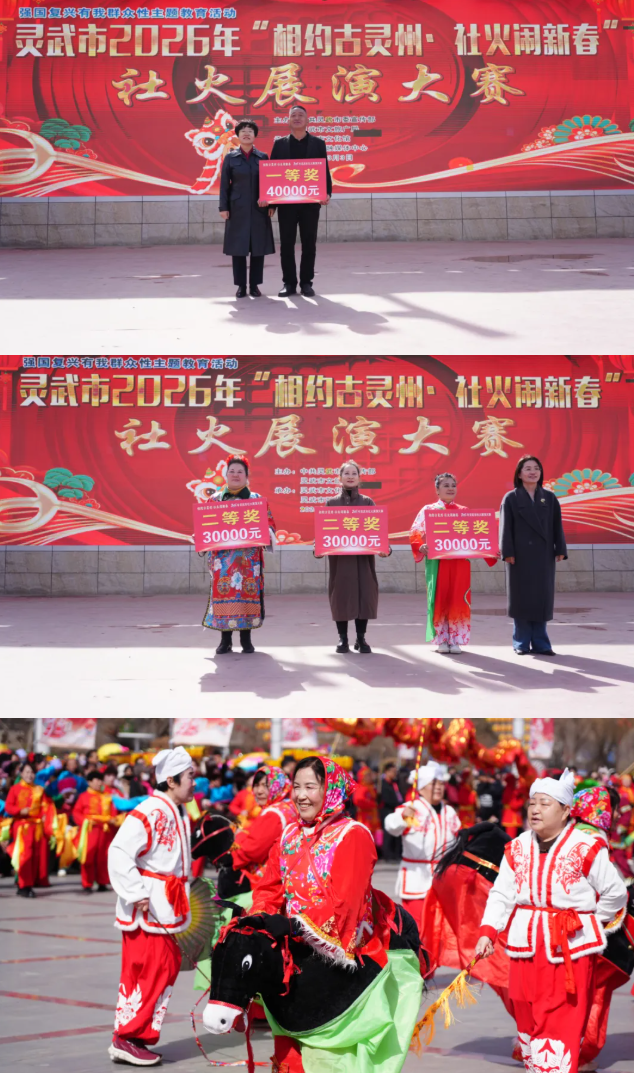 一路欢腾前行,一路好戏连台。巡游队伍最终抵达灵州广场,“相约古灵州?社火闹新春”社火展演大赛正式鸣锣开赛,14支社火队伍同台竞技、各展所长,将这场元宵盛会推向高潮。赛场上,各支队伍将灵武本土民俗特色、时代发展新风与传统社火技艺深度融合,既有原汁原味的经典民俗节目,也有紧扣时代脉搏的创新编排,每一段展演都饱含对新春的美好祝福,每一个动作都展现着灵武人民昂扬向上、奋发进取的精神风貌,为现场观众献上了一场精彩纷呈、底蕴深厚的民俗文化盛宴。