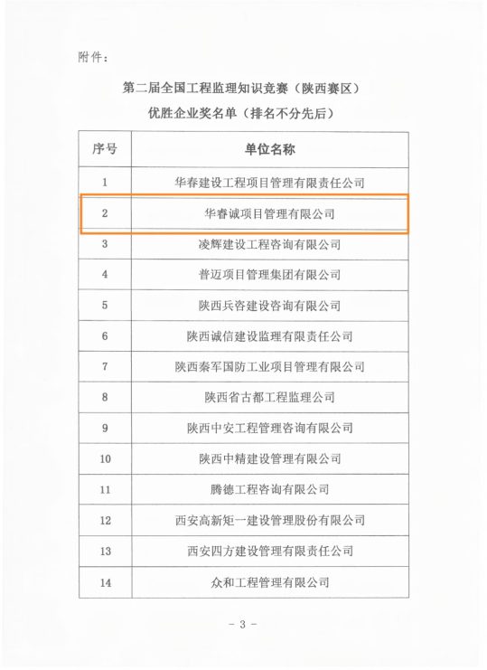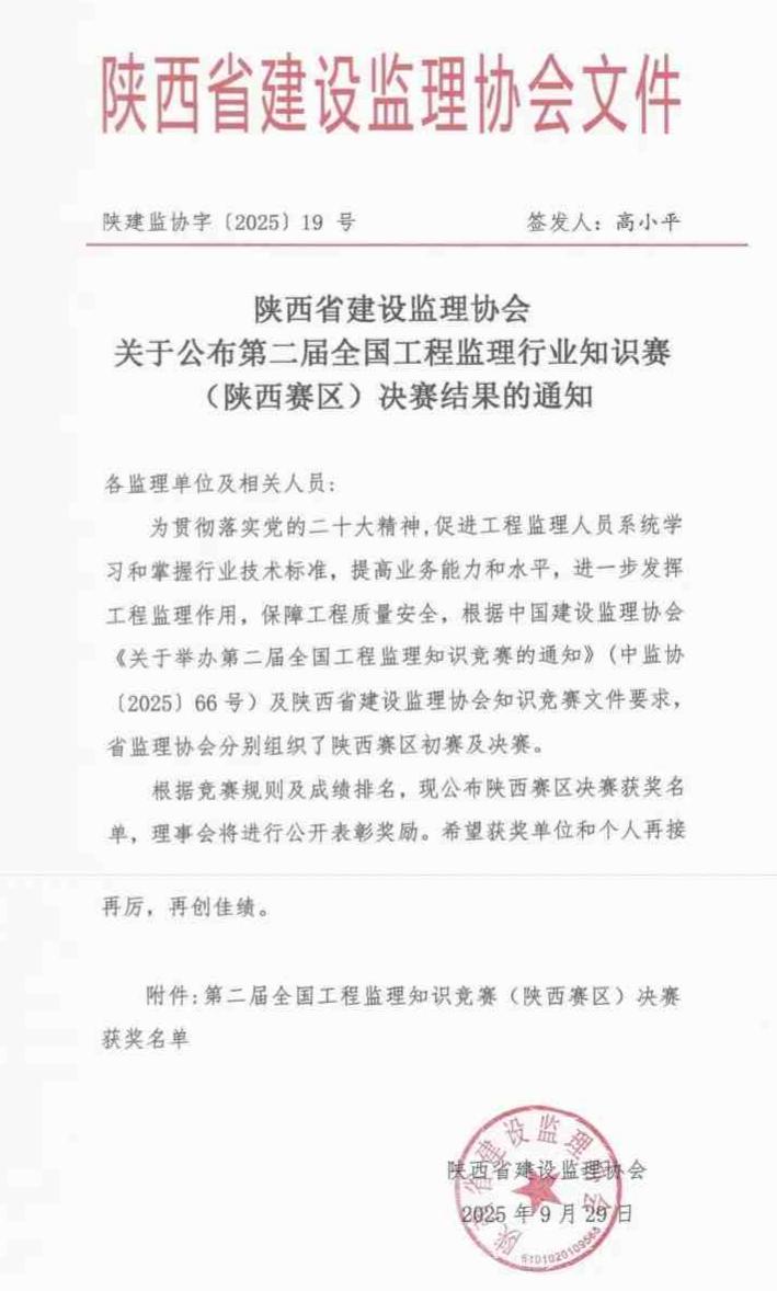 2025年,近日,陕西省建设监理协会正式发布《关于公布第二届全国工程监理行业知识竞赛(陕西赛区)决赛结果的通知》(陕建监协字〔2025〕19 号)。在此次竞赛中,华睿诚项目管理有限公司凭借扎实的专业素养和出色的团队表现,荣获“优胜企业奖”,公司员工在个人赛中荣获总监组三等奖。