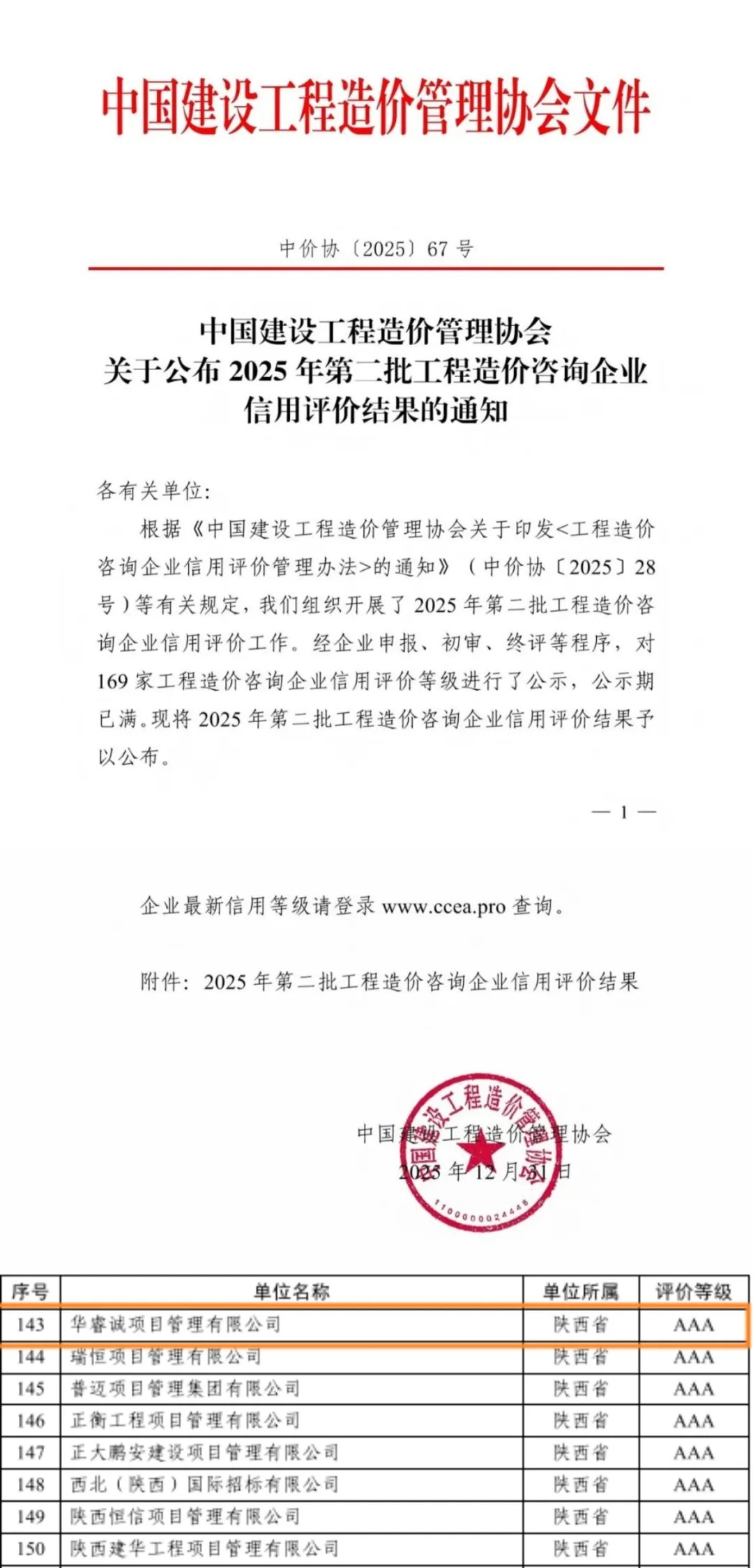 2025年12月31日,中国建设工程造价管理协会正式公布2025年第二批工程造价咨询企业信用评价结果,华睿诚项目管理有限公司获评AAA级信用企业。