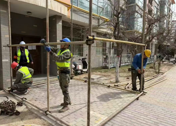 在灵武市龙辰苑小区老旧小区改造项目现场,记者看到,工人们正在进行脚手架搭建、吊篮安装及检测工作。小区西门外,新的供热管道已铺设完成,等待检测,项目已进入全面复工阶段。