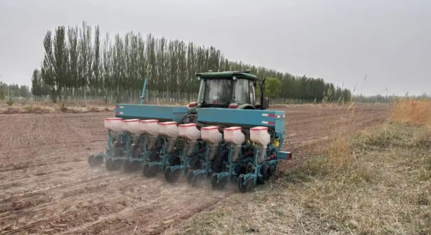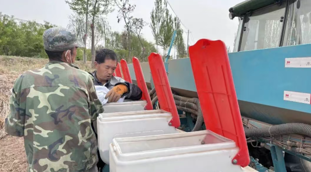 在北滩村种植地块,机械在地里来回穿梭,农户协作,一边播种完成后,一边立即开始药物覆膜,确保良种下地、苗齐苗壮,全力保障毛豆稳产增收。
