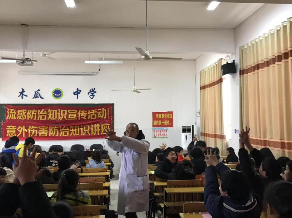 据悉,此项活动由木金乡卫生院主办,聘请临床经验丰富的彭医生担任主讲,深入全乡中小学进行巡回宣讲。木瓜中学作为活动的第一站,两场讲座,干货十足,五百师生,收获满满。讲座中,彭医生用形象生动的语言向师生讲授了“海姆里克急救法”,并与师生互动示范,学生听得懂,看得清,学得会,记得牢;配合案例介绍了人工呼吸与胸外心脏按压等急救方法,既给人以警醒,又让方法技巧深入人心;通过发放宣传资料,从专业角度将流感的病原体、传染源、传播途径、易感人群、预防措施等毫无保留地呈现在师生面前,告之师生要早发现、早诊断、早隔离、早治疗。