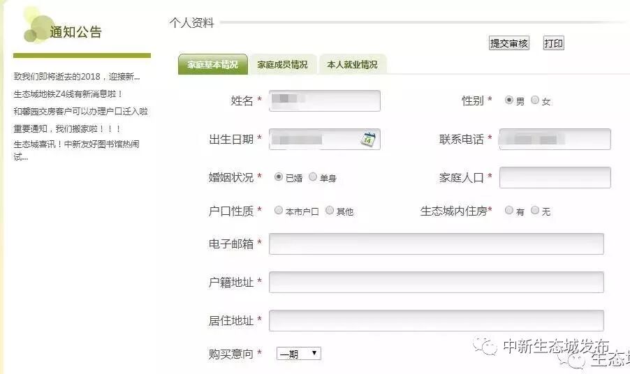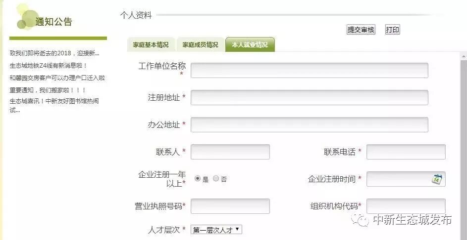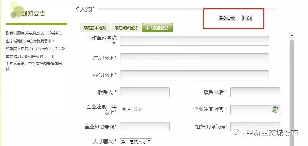 5、全部信息填写完毕后,点击提交审核,并打印《中新天津生态城公屋购房审查表》