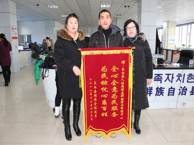2018年12月26日,县朝侨协会会长一行两人来到县政务服务大厅,向县人社局社会保障卡经办窗口送来锦旗,对人社局在办理外籍人员申领社会保障卡过程中提供的优质、高效服务给予感谢。