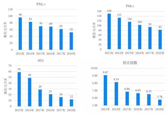 6项主要污染物中,除臭氧(O3)浓度同比上升4.7%外,PM2.5等5项均明显改善;可吸入颗粒物(PM10)、二氧化硫(SO2)、二氧化氮(NO2)和一氧化碳(CO)年均浓度分别为82微克/立方米、12微克/立方米、47微克/立方米和1.9毫克/立方米,较2017年下降幅度分别为12.8%、25.0%、6.0%和32.1%。