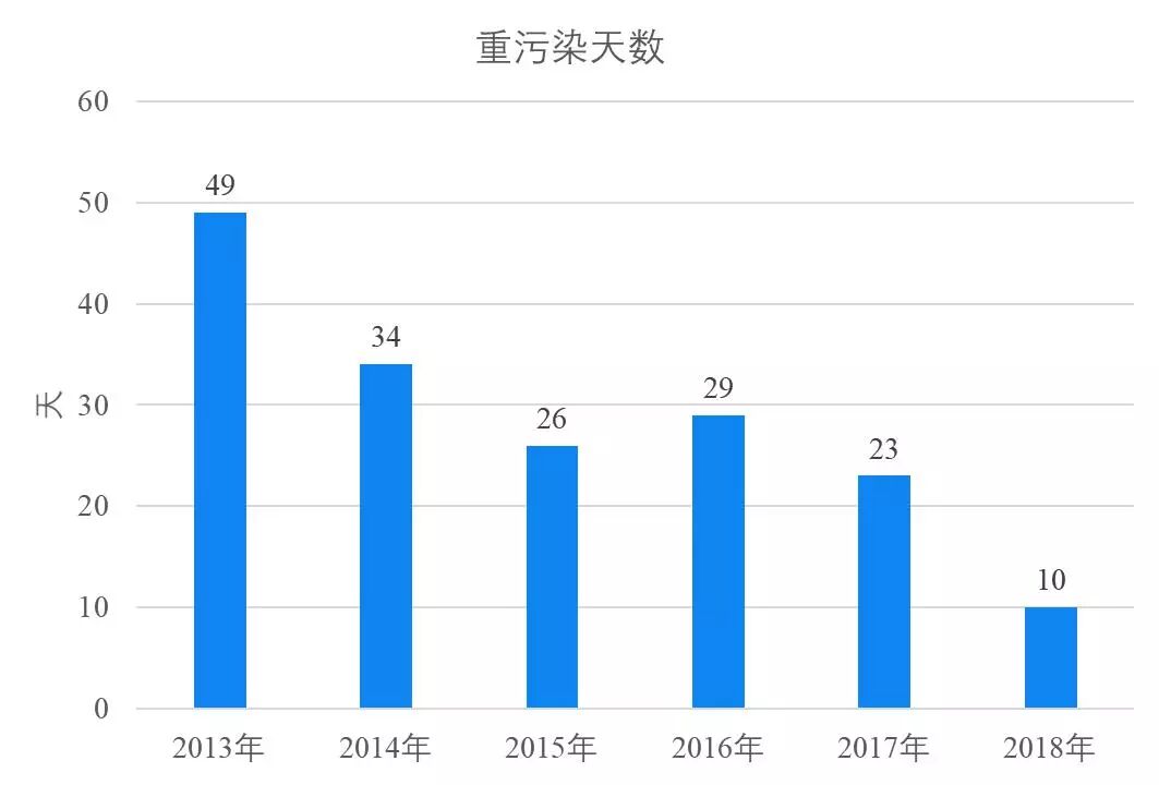 2013-2018年,天津市空气重污染天数明显降低,从2013年的49天降至2018年的10天,减少39天,重污染天气发生率明显降低。