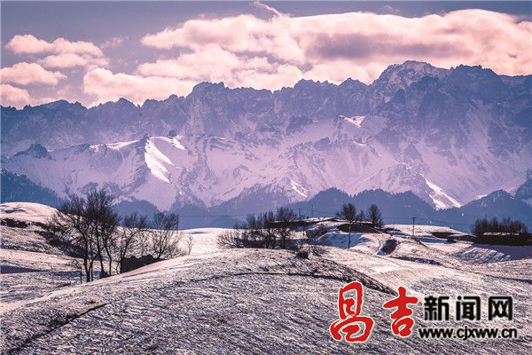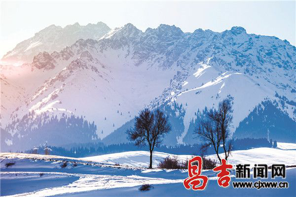 冬天的江布拉克是一片雪原。自然的风光让人沉醉,让你感觉自己到了圣洁之地。麦田里,几棵稀疏的树木在远方伫立着,它就像是上天派来的使者,来看守着这一片圣洁的土地。