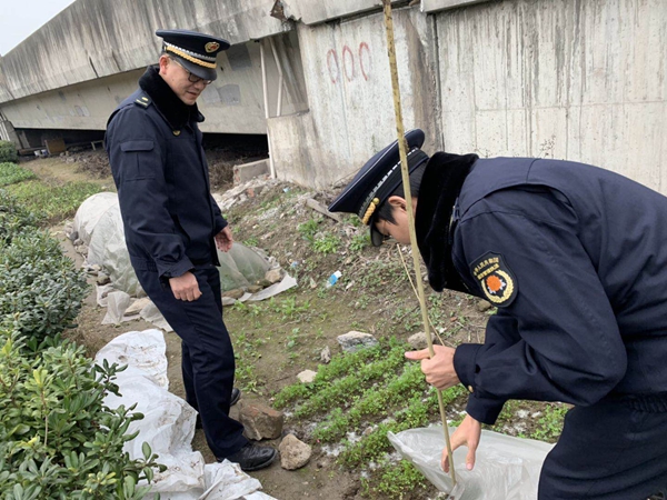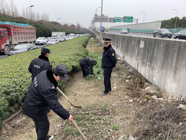 2019年1月15日,莘庄城管接市民举报闵松路高架下有人在公共绿地种菜。种菜这个问题不仅仅影响市容环境,在高架及道路边种菜进进出出的还有交通安全的隐患。为此中队队员们立即行动,会同市容管理公司赶赴现场处置。