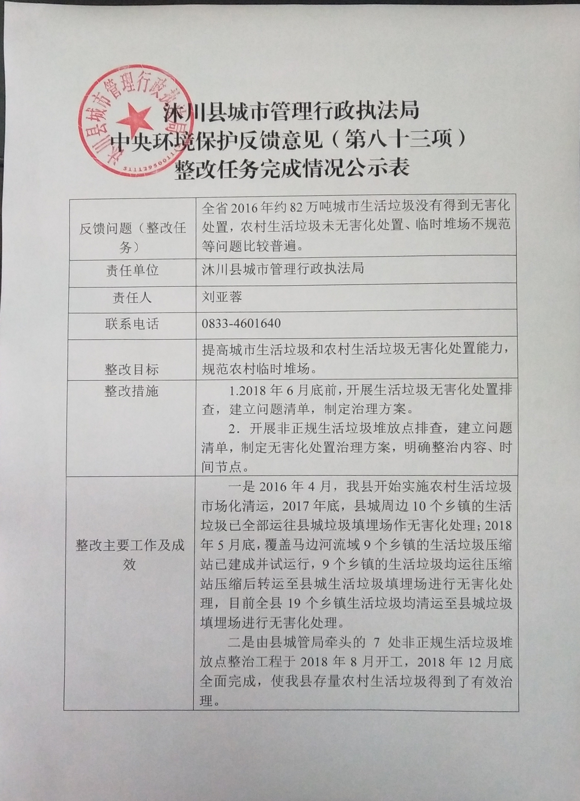 沐川县城市管理行政执法局中央环境保护反馈意见(第八十三项)整改任务完成情况公示表