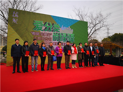 1月14日,梅陇镇“爱分类 尚绿驿”暨垃圾分类誓师大会主题宣传活动在梅馨陇韵公园举行。区绿容局工会主席葛余彬、垃圾分类办主任吴慧,副镇长俞政、龙跃波,镇相关职能部门、村公司、居民区、学校负责人及居民代表共100余人参加活动。