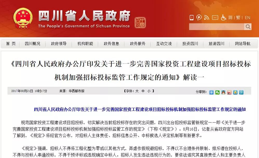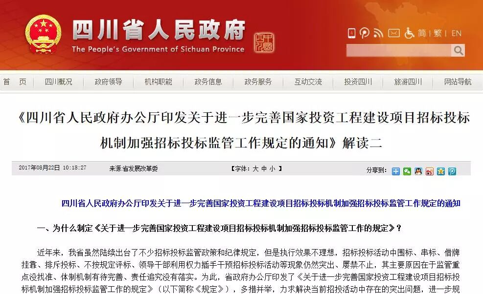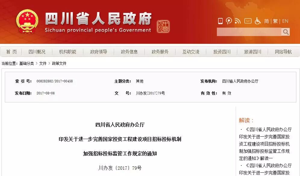 2017年8月6日,四川省人民政府办公厅印发《关于进一步完善国家投资工程建设项目招标投标机制加强招标投标监管工作规定的通知》(川办发〔2017〕79号)。该省为推广该项招投标举措,还在政府官方网站上做出了两个权威解读文件。