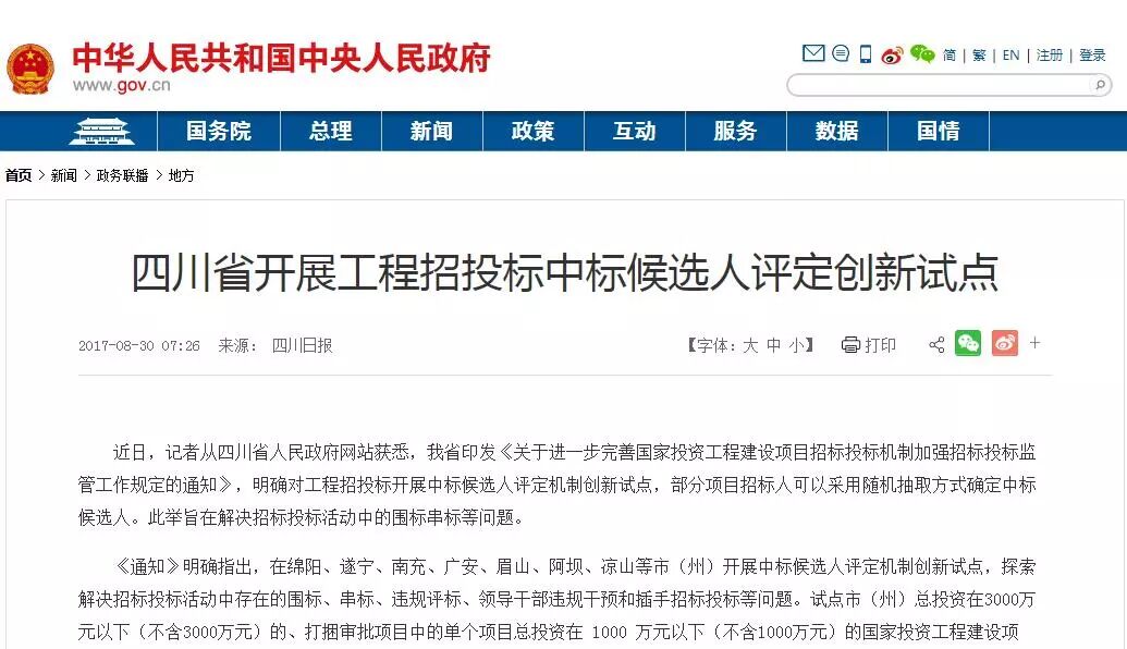 四川省招投标创新试点在中央政府网站上的报道截图