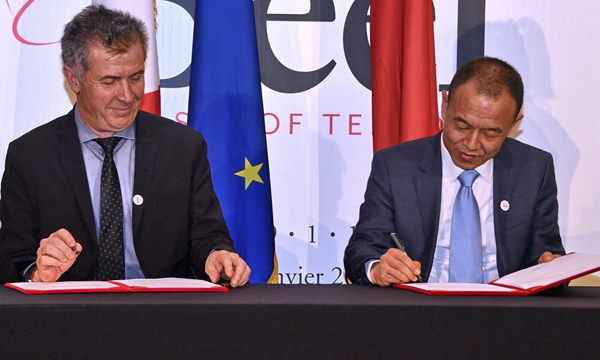 ▲1月16日晚,法国牛肉中国官方首发仪式在法国驻华大使馆举行。图为内蒙古科尔沁牛业总经理王征涛(右)与法国品格涅尔公司负责人签订合作协议。