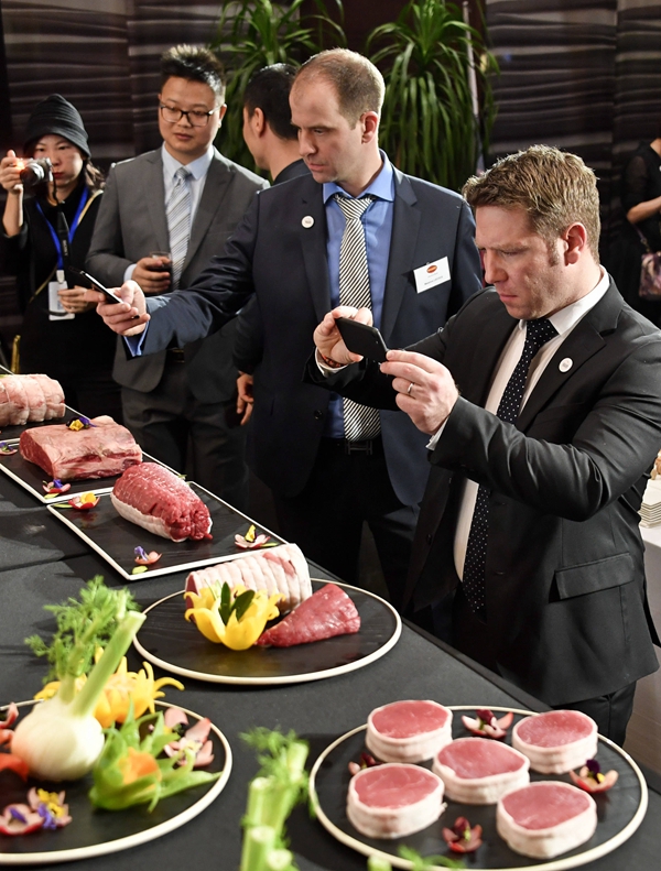 ▲1月16日晚,法国牛肉中国官方首发仪式在法国驻华大使馆举行。图为来宾拍摄法国牛肉展品。