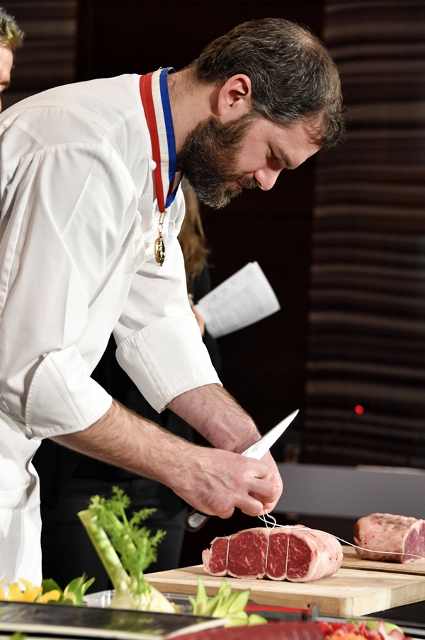 ▲1月16日晚,法国牛肉中国官方首发仪式在法国驻华大使馆举行。图为来自法国的牛肉分割大师在表演法国传统牛肉分割技艺。