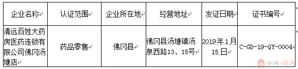 广东省清远市药品零售企业GSP认证公告 C-GD-19-FG第01号