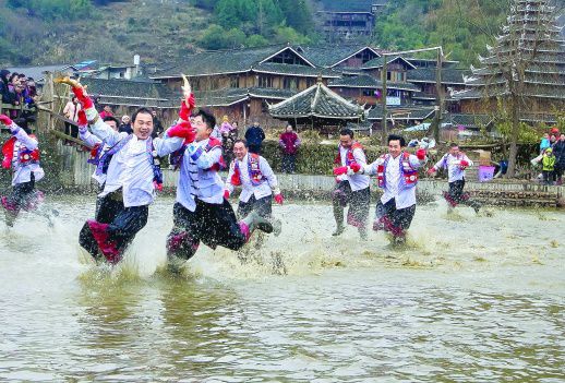 1月18日,通道侗族自治县皇都侗寨,村民们在表演当地过年风俗“抢”鱼大赛。春节临近,该县侗寨都陆续开展文艺演出、“抢”鱼、打糍粑等民俗活动,为春节增添喜庆气氛。尹序平 摄
