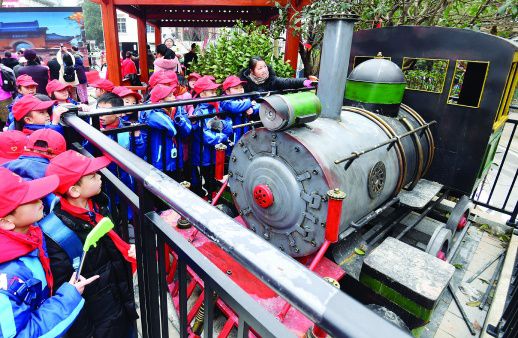 1月18日,长沙市天心区赤岭路街道广厦新村社区,学生在参观“火车头”党建文化公园。2018年,该社区将位于辖区内的长沙老火车南站 (货运站)提质改造,打造了“火车头”党建文化公园,宣传“火车头”精神。 湖南日报记者 田超 摄