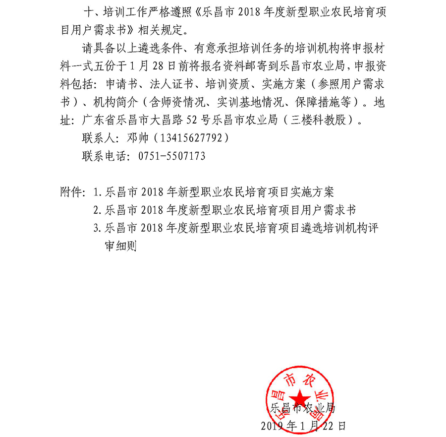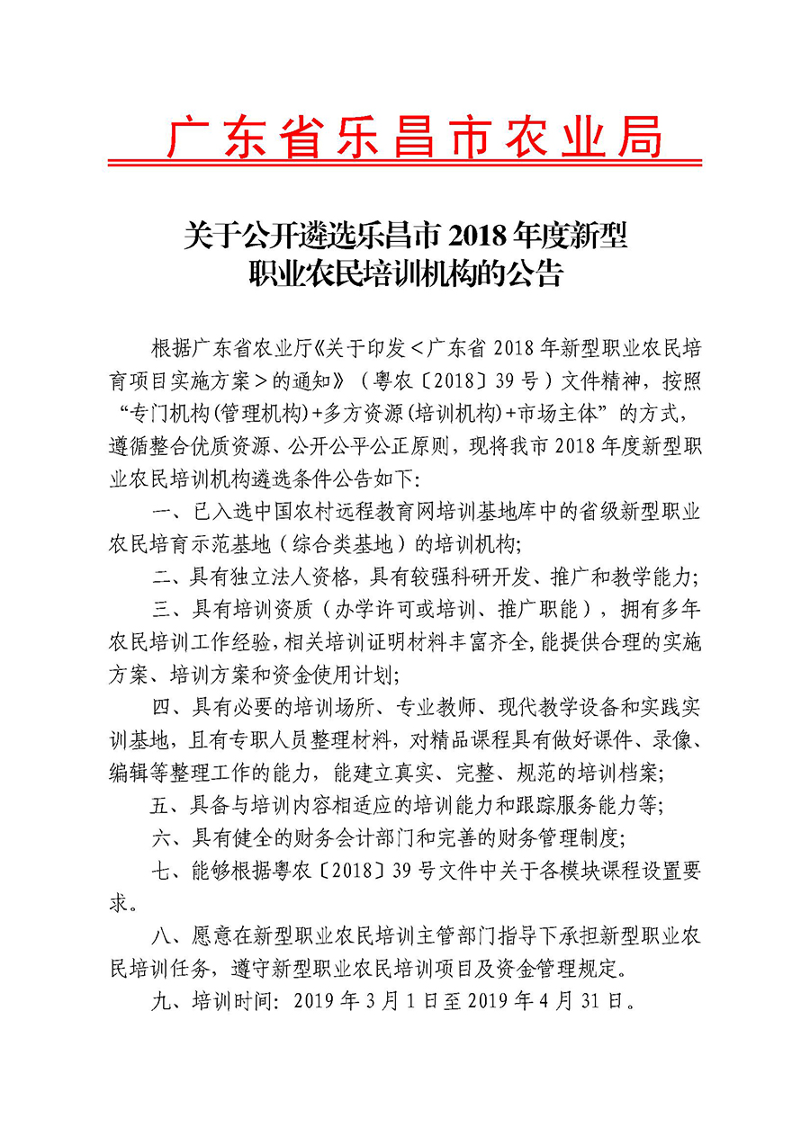 关于公开遴选乐昌市2018年新型职业农民培训机构的公告