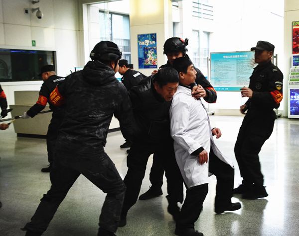 下午3点演习在院区病房楼大厅正式开始。一名歹徒携带凶器进入大厅,挟持医护人员并持刀威胁,处理突发事件的安保人员携带装备迅速到达指定位置,严格分工,各司其责,控制现场。安保人员利用歹徒与医生护士对话中注意力转移之际,迅速用锁脚器、钢叉、盾牌将持刀歹徒与医护人员隔离,随即将持刀歹徒控制,医护人员得到安全解救。