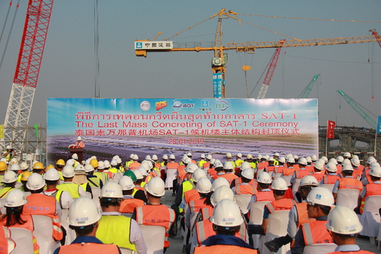 由中国建筑集团有限公司承建的泰国素万那普机场扩建项目卫星厅新候机楼28日下午举行主体结构封顶仪式,提前约两月封顶。