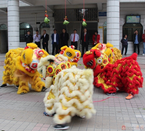 在舞醒狮鼓声中,镇委、镇政府全体领导到场迎接新春的到来!来自全镇的40头醒狮让整个政府大院喜气洋洋。