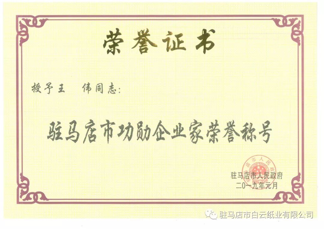 白云纸业总经理王伟荣获 “驻马店市功勋企业家”荣誉称号