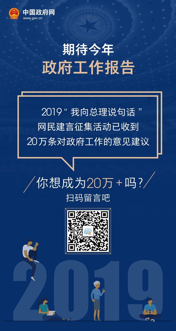 2019“我向总理说句话”网民建言征集活动留言已突破20万条。扫描上方二维码参与活动,为政府工作提意见建议。