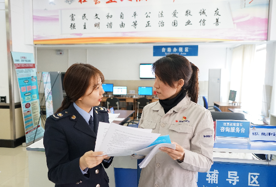 近日,为更好服务本辖区内重点税源企业,国家税务总局鞍山市税务局第一税务分局成立“大企业税收服务青年突击队”,图为青年干部为鞍钢股份有限公司办税人员解决涉税疑难。?