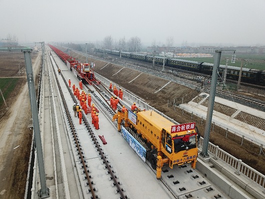 2月26日,中铁十八局的工作人员在安徽亳州进行铺轨作业(无人机拍摄)。