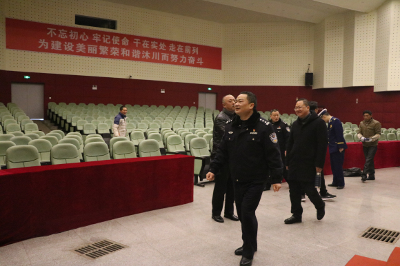 2月25日至28日, 沐川县将隆重召开“两会”,为给“两会”顺利召开创造安全稳定的环境,2月22日,沐川县公安局副局长李勇率县局治安大队长余敏会同县住建局、文广新局、消防大队工作人员深入“两会”会场和代表、委员入住酒店进行安全大检查。