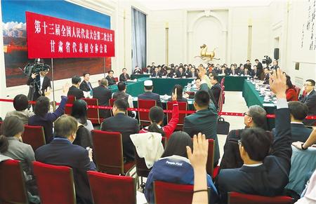 3月9日上午,出席十三届全国人大二次会议的甘肃代表团在人民大会堂甘肃厅举行开放团组活动,吸引了近50家中外媒体到现场采访。