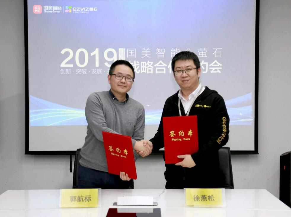 会谈中,双方共同探讨2019年的战略合作方向,国美智能将接入萤石全套智能安防,进一步完善国美智慧家庭整体解决方案在线上线下的全面落地,为用户打造安全舒适的家空间。而萤石网络也将借力于国美智能家电产品优势以及终端渠道优势,全面落地智能安防硬件,双方以此达成互利共赢。