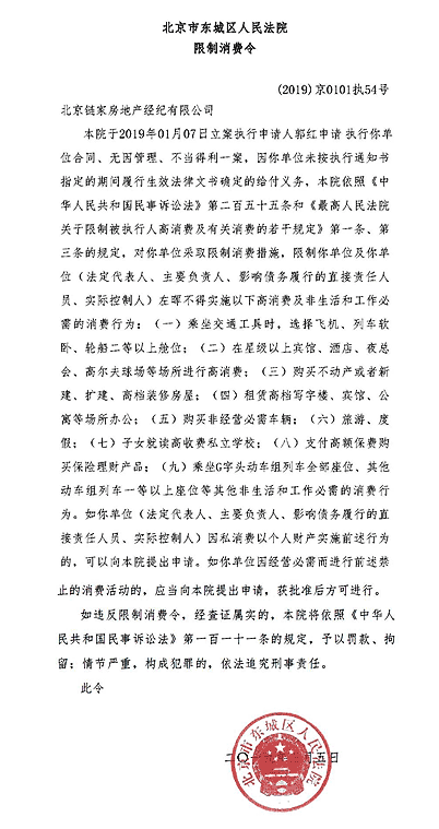 中国执行信息公开网信息显示,因北京链家房地产经纪有限公司(简称“链家”)未按照执行通知书制定的区间履行生效法律文书确定的给付义务,对北京链家房地产经纪有限公司及实际控制人左晖采取限制消费措施。