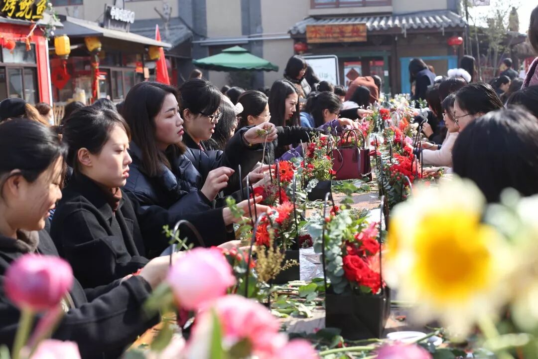 活动过程中,专业花艺老师为女职工们讲授了插花艺术的基本知识,重点讲解了插花选型、色彩应用以及花的品种等内容,现场向大家示范了各种造型的插花制作方法。大家边听边学边动手,一株株玫瑰、康乃馨、百合、圣诞草经过设计修剪变得更加错落有致、美丽动人。鲜花簇拥、花香满溢的活动现场,给“二月二”的小镇增添了更多的活力,吸引市民游客纷纷驻足观看,跃跃欲试。