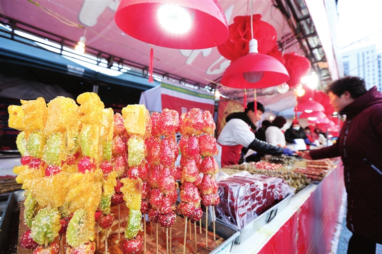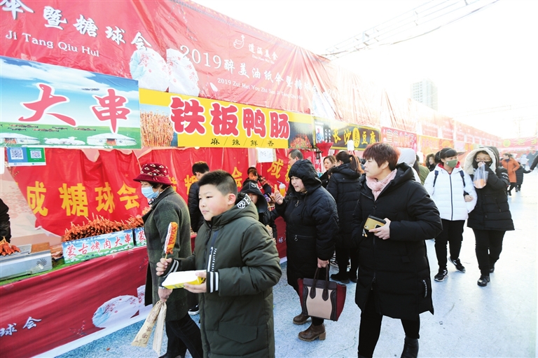 此次美食盛会的主角是“糖球”,又称“冰糖葫芦”,是我国传统美食。活动现场,很多家长带着孩子来品尝传统美食、体验游戏。来自枣庄市的冯家冰糖葫芦经营者冯兵兵已是第3次来荣成参加佳华美食文化节,这次他为市民和游客准备了18个品种的冰糖葫芦,酸甜可口的冰糖葫芦引得人们争相购买。“荣成糖球会我每年都来,这里的人特别多,我的销量好,每天销售数量7000串到8000串,营业额在3万元左右。”冯兵兵说道。