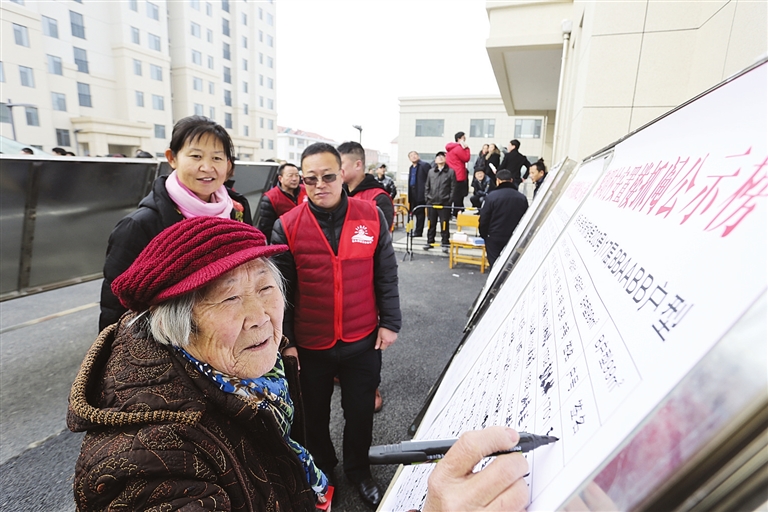 村民王秉芝老人抽到新房后开心地在公示板上签下自己的名字。