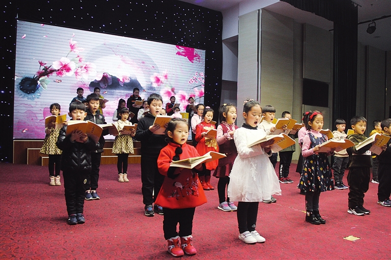 经典诵读结营仪式上,孩子们共同诵读经典名篇,品味传统文化。