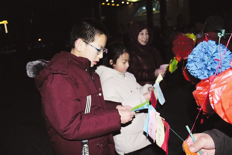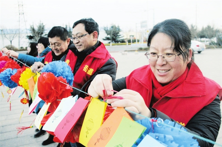 在崖头街道双泊社区,由社区工作人员、在职党员以及高中生组成的志愿者队伍在现场张灯结彩,为晚上的猜灯谜活动做着最后的准备。