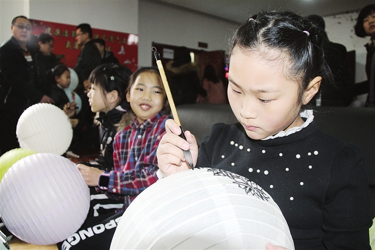 孩子们参加市文化馆“团团圆圆闹元宵”系列活动,纷纷一展身手,将含有美好寓意的图案呈现在纸灯笼上。