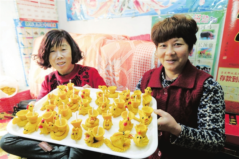 王连街道寨前方家村妇女展示做好的豆面灯。