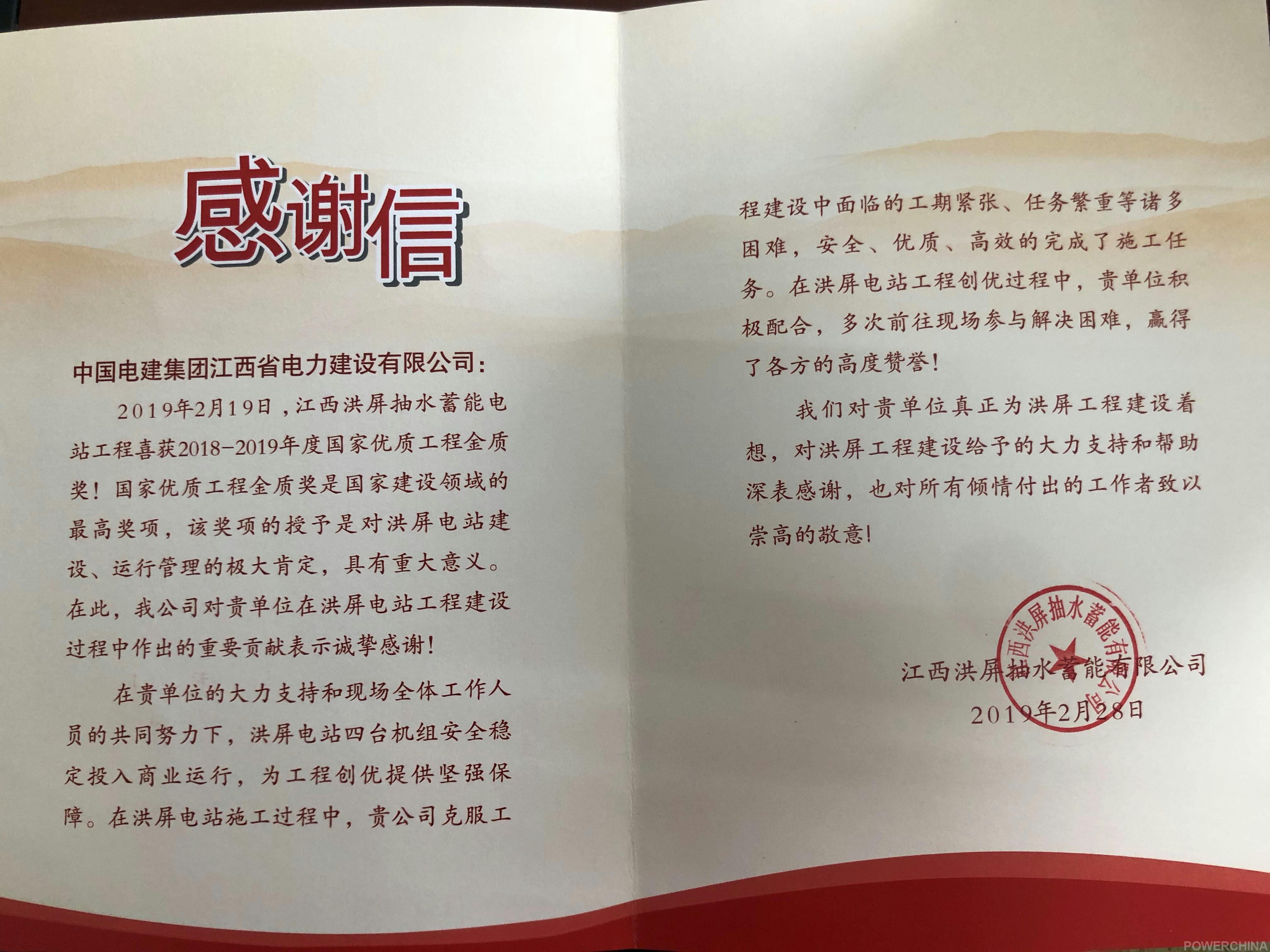 日前,江西电建收到一封来自江西洪屏抽水蓄能有限公司发来的感谢信。信中写道:江西电建不仅在洪屏抽水蓄能工程(获2018-2019年度国家优质工程金质奖)建设过程中,克服工期紧张、任务繁重等诸多困难,安全、优质、高效地完成检测任务,为工程建设作出贡献。在工程创优过程中,公司参建的金属检验人员积极配合,多次前往现场参与解决困难,充分展现了“开放、创新、诚信、共赢”的央企品牌形象。