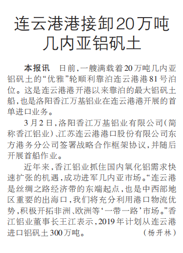 【中国交通报】连云港港接卸20万吨几内亚铝矾土