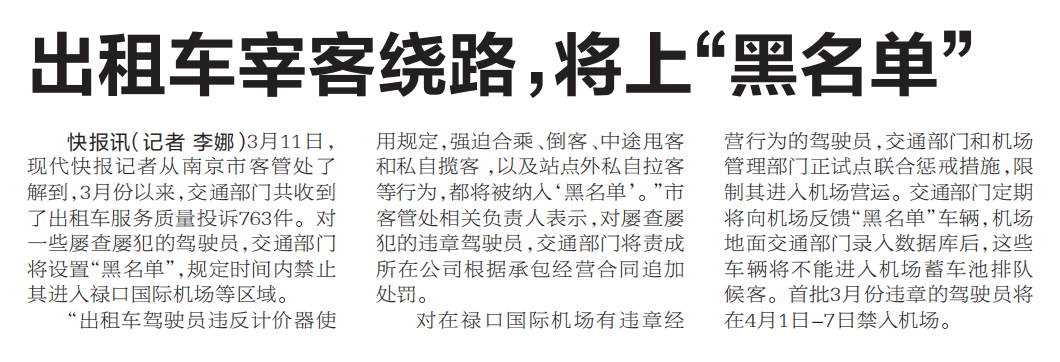 【现代快报】出租车宰客绕路,将上“黑名单”