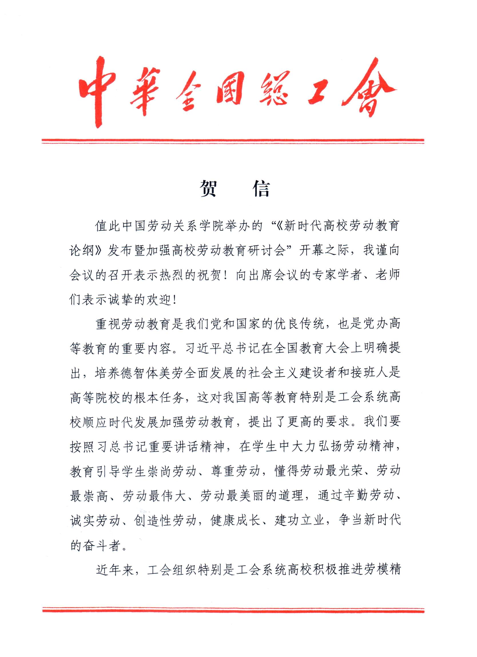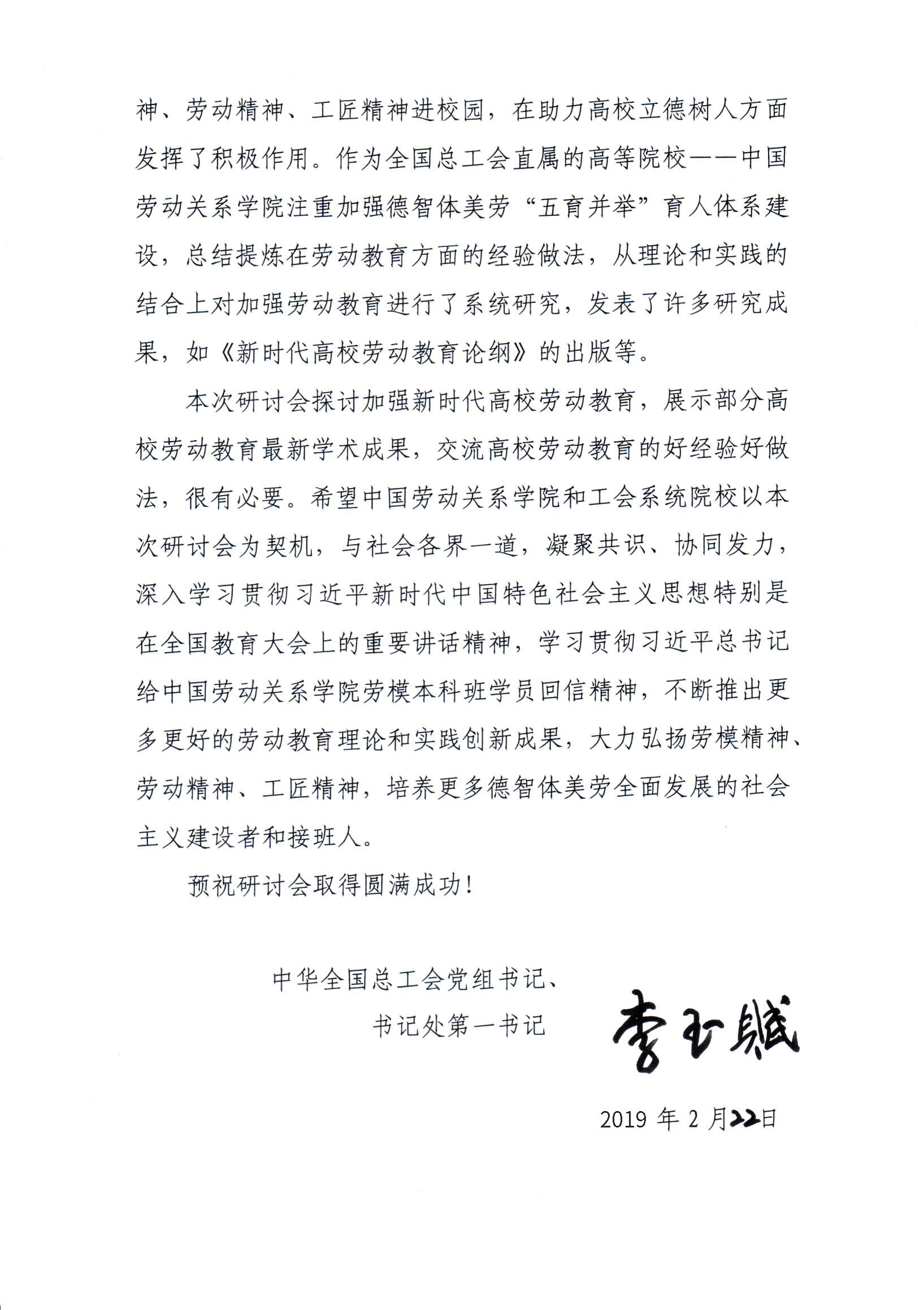 中华全国总工会党组书记、副主席、书记处第一书记李玉赋向我校《新时代高校劳动教育论纲》发布暨高校加强劳动教育研讨会发来贺信