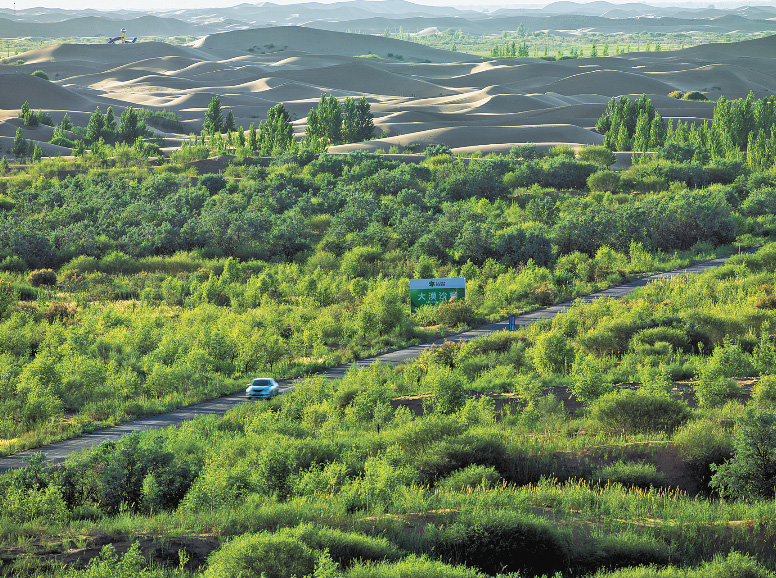从1997年10月开始,杭锦旗在3年内举行了5次治沙大会战。如今,当年的第一条穿沙公路充满生机。