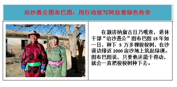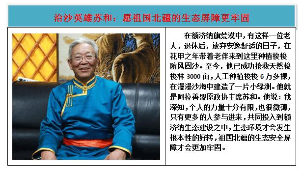 在长年的生态治理中,内蒙古涌现出了苏和、图布巴图、张喜旺、莫日根道尔计、敖特更花等许多防沙治沙先进个人,他们在沙漠植下绿色,书写希望。