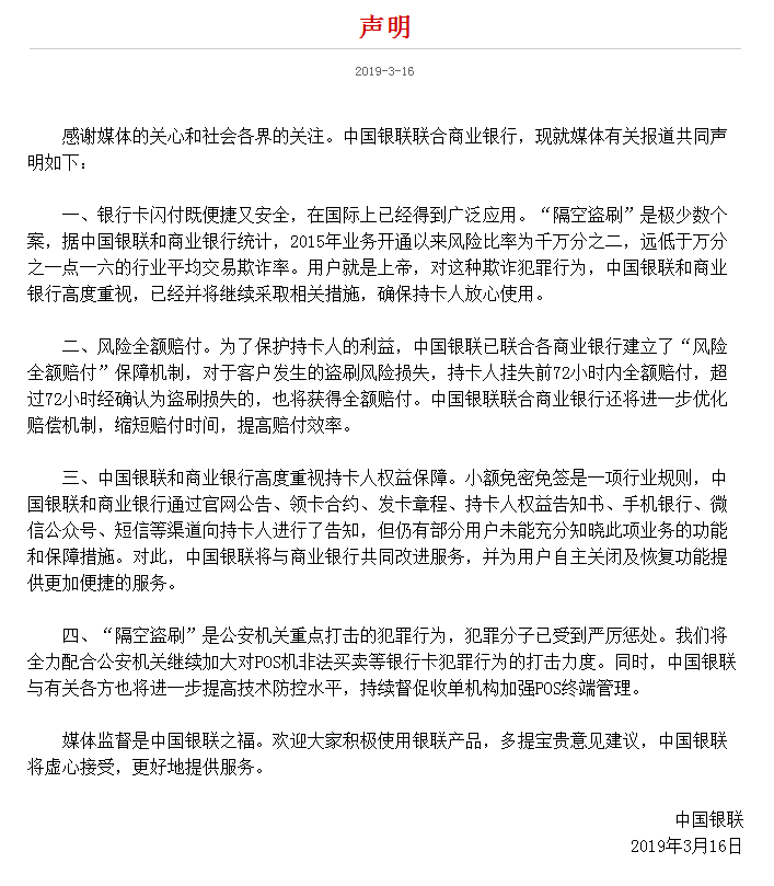 3月16日,银联针对此事给予回复,称“隔空盗刷”是极少数个案。
