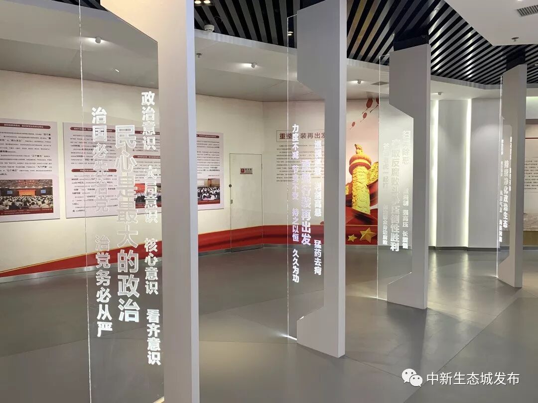 生态城党群服务中心位于中新友好图书馆,建筑面积2034平方米,展厅面积954平方米,分为六部分:第一部分是序厅,回顾习近平总书记2013年5月视察生态城时作出的重要指示;第二部分“领航中国”,深入解读习近平新时代中国特色社会主义思想;第三部分“党建铸魂”,全面介绍生态城党建工作成就;第四部分“警钟长鸣”,展示党的十八大以来全面从严治党取得的成果;第五部分“红路初心”,回顾中国共产党的风雨历程;第六部分“复兴伟业”,展望中华民族的复兴之路。在中心展厅,广大党员可通过视频、图文等形式学习党建知识,开展党史党纪党规教育活动。